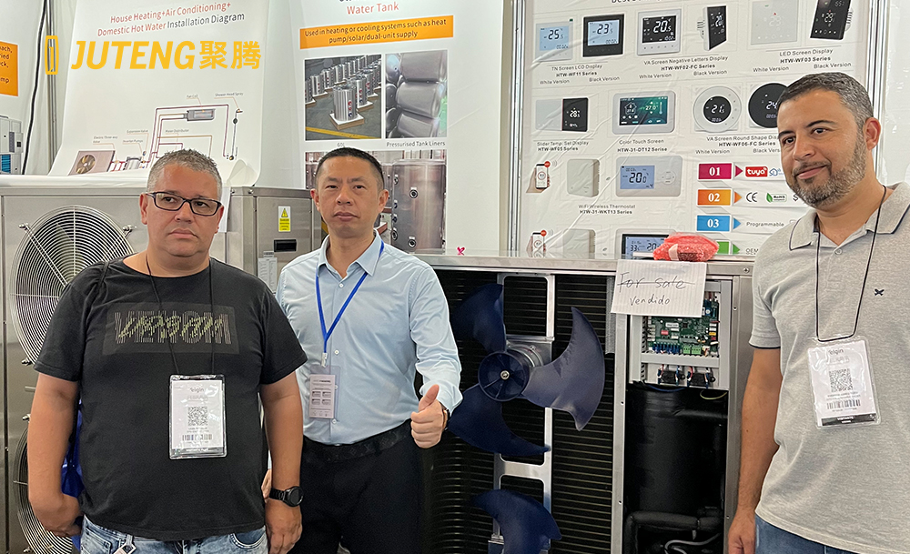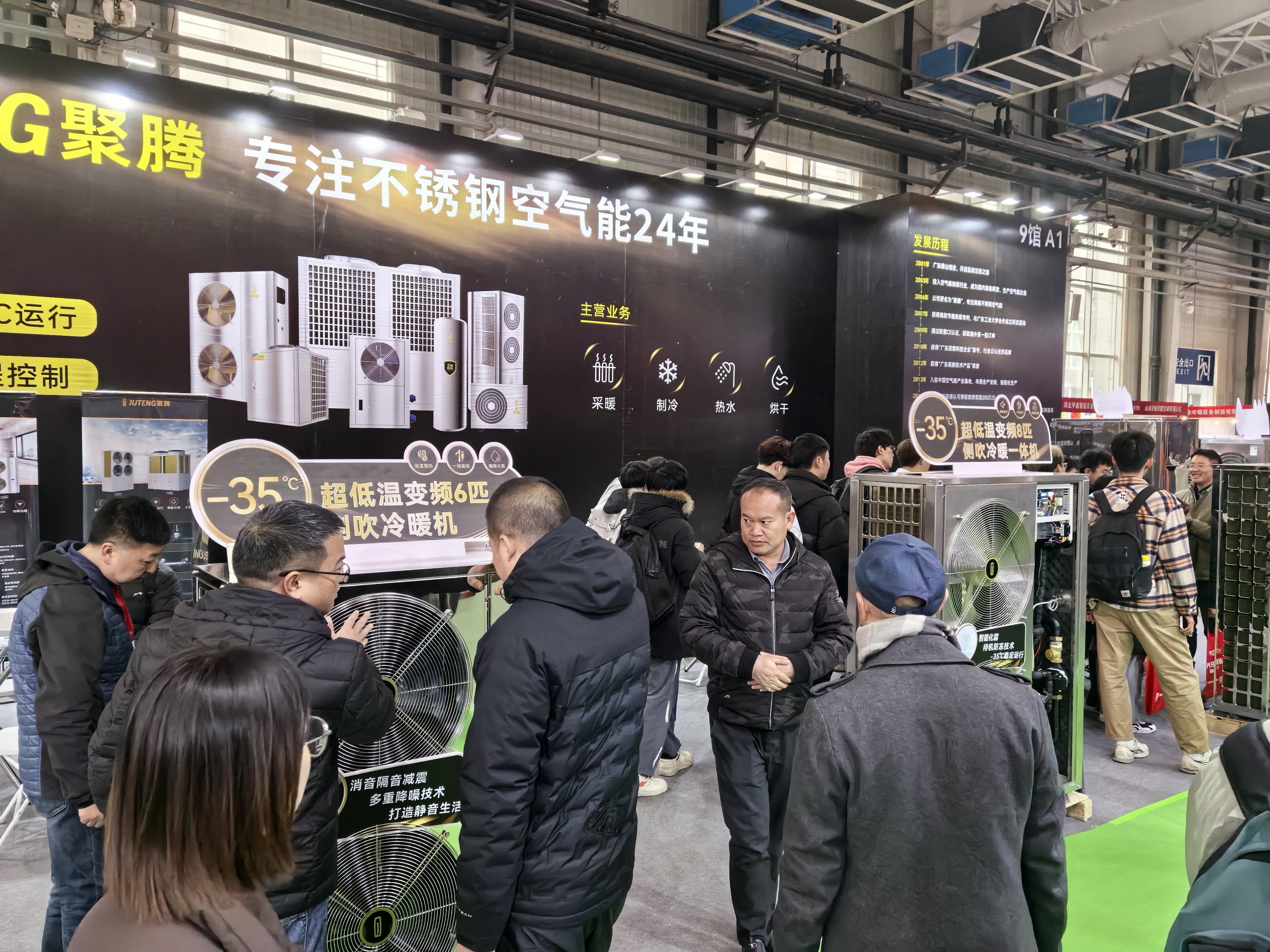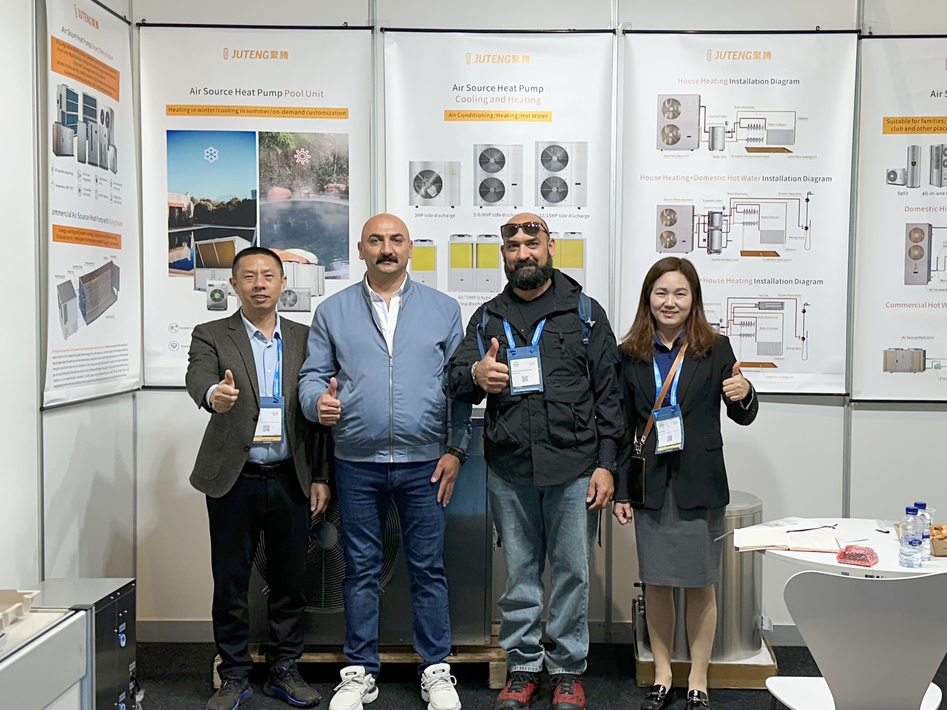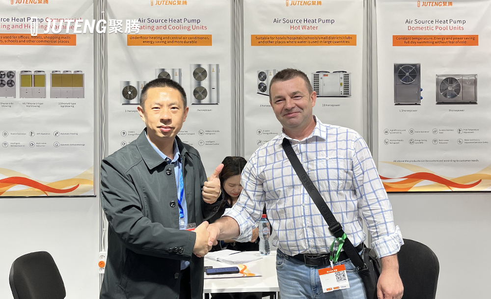 聚騰的創新研發成果在本次展會中閃亮登場——超低溫冷暖機、恒溫泳池機、家用熱水機等覆蓋歐洲多個熱銷品類的環??諝饽墚a品,因其獨特的不銹鋼整機造型設計、行業領先的研發專利技術以及多領域的空氣能解決方案,引起現場觀眾的濃烈興趣,釋放出合作交流的積極信號。